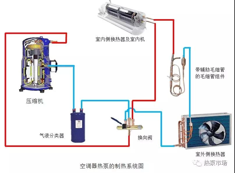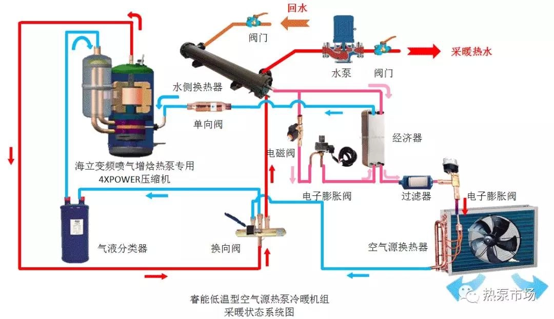 最后,我们再来看一下,空气源热泵中的新贵,低温空气源热泵与空调在系统设计上的不同。在北京“煤改电”的政策推动,空气源热泵在低温环境的制热技术得到一个新的提高,就是直流变频喷气增焓技术的应用,使得空气源热泵在“煤改电”活动中,在诸多采暖设备中独占鳌头、独步天下。