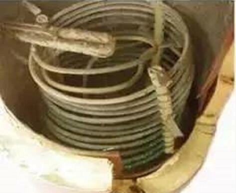 B 外盘管:外盘管是指把铜管盘在内胆外面,透过内胆间接加热,不直接与水接触。