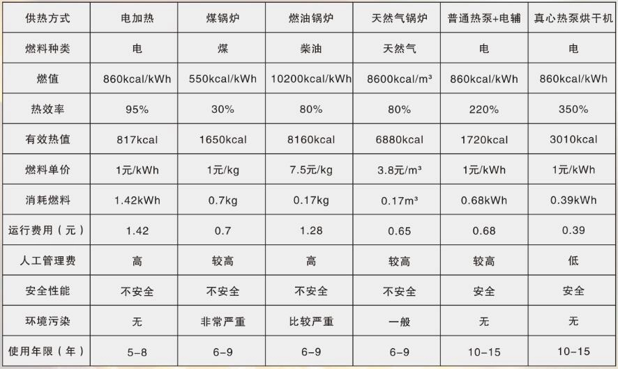 (运行对比:在环境温度20℃,不同热源烘干除去1kg水分,运行情况分析)