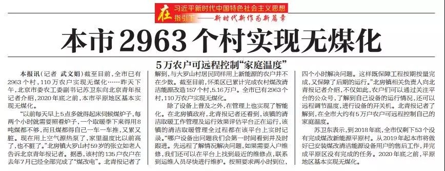 截至目前,北京市已有2963个村,110万农户实现无煤化……12月5日下午,北京市委农工委副书记苏卫东向记者介绍,2020年底之前,北京市平原地区基本实现无煤化。“以前每天早上5点多就得起床伺候煤炉子,每两个小时就需要照看炉子,一个取暖季下来得用8吨煤都不够,而且煤都得自己一车一车推,又累又脏。现在用上空气源热泵了,家里温度比以前高了,也不脏了。”北房镇大罗山村59岁的张立如老人告诉记者。据悉,该村的135户农户在去年7月已经全部完成了“煤改电”。记者了解到,与大罗山村居民同样用上新能源的农户并不在少数。截至目前,怀柔区已累计完成农村煤改清洁能源改造157个村,5.16万户。全市已有2963个村,110万农户实现无煤化。