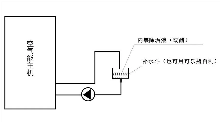 具体的做法是:关掉循环管路上的阀门,把循环管路截断,在循环水泵水路进水口加一个补水斗(也可以用一个可乐瓶自制一个补水斗),把主机的出水口管路接到补水斗里面,在补水斗里面使用专业除垢剂,按使用说明书配适当的水,进行开机循环来对换热器进行清洗。