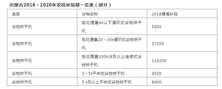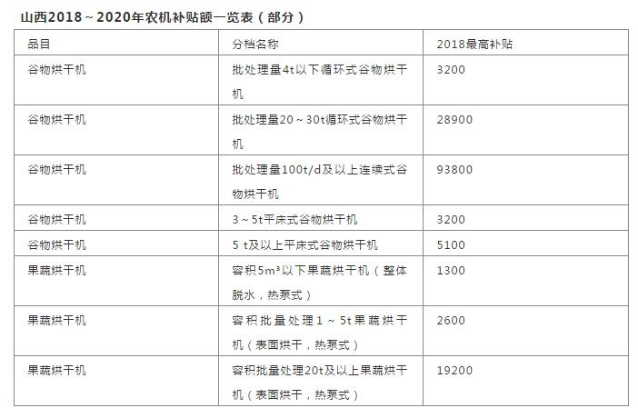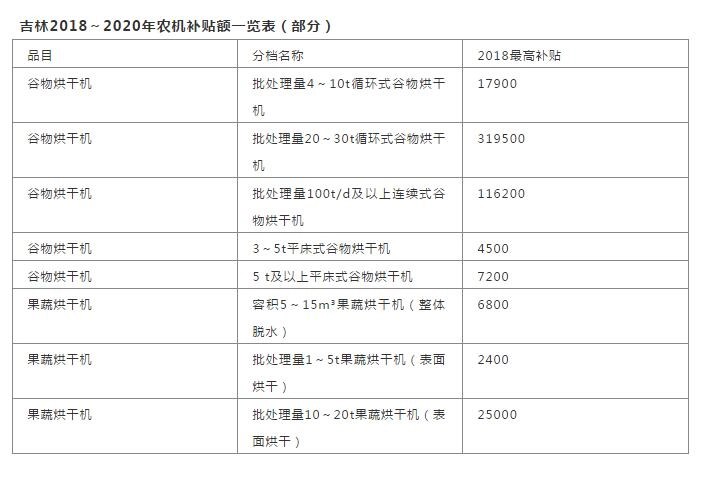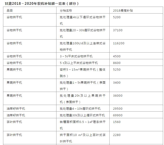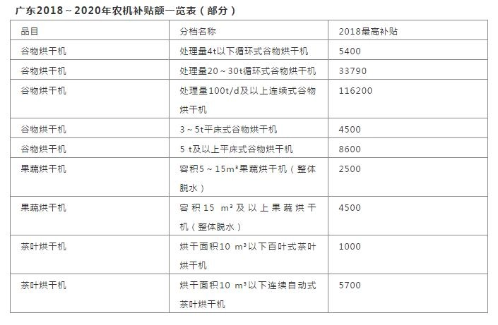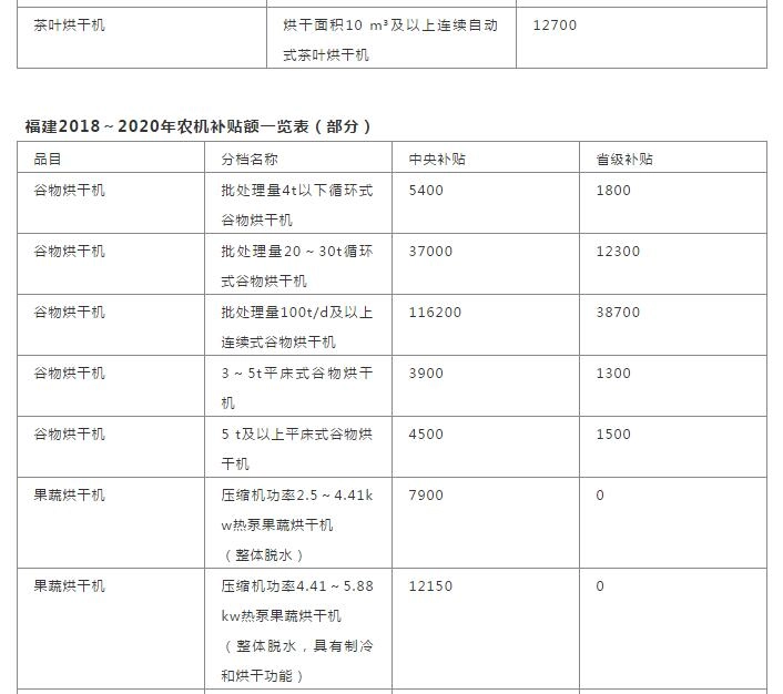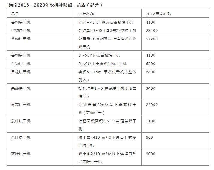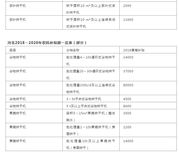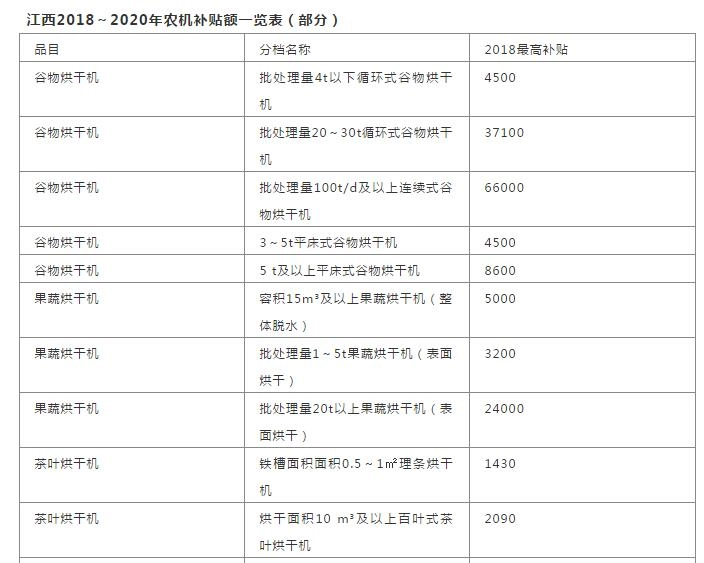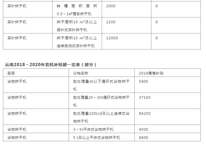 为切实做好2018~2020年农机购置补贴工作,近期农业部农业机械化技术开发推广总站发布《2018~2020年全国通用类农业机械中央财政资金最高补贴额一览表》,在第五大类第三小类中,干燥机械部分的3个品目:谷物烘干机、果蔬烘干机、油菜籽烘干机;在第六大类的茶叶加工机械中也有一个品目:茶叶炒(烘)干机。一般补贴机具单机补贴额原则上不超过5万元;烘干机单机补贴额最高12万元。