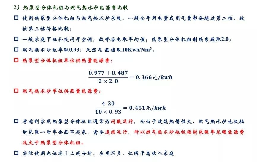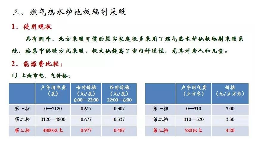 第二类是燃气热水炉地板辐射采暖。习惯于国外或北方采暖方式的殷实家庭很多采用了燃气热水炉地板辐射采暖系统,按集中供暖方式采暖,极大地提高了室内舒适性,尤其对老人和儿童。但是从能源费用来看,使用燃气热水炉采暖或分体机空调,一般全年用气量或用电量都会超过第二档,故按第三档计算。燃气热水炉效率取0.93,天然气热值取10kwh/Nm³,单位供热量能源费为0.451元/kwh。分体机组制热系数取2.0,单位供热量能源费为0.366元/kwh。