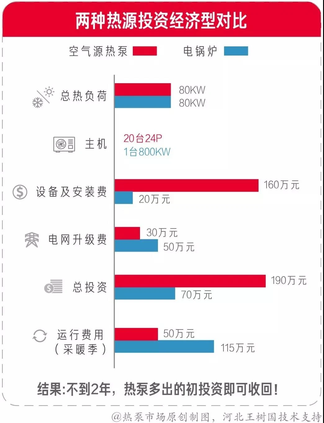 我们先计算前提投资,采用电锅炉采暖的总投资费用=设备和安装成本+电网升级成本=20万+50万=70万元;采用空气源热泵采暖的总投资费用=160万+30万=190万。空气源热泵总投资要多出190万-70万=120万元。