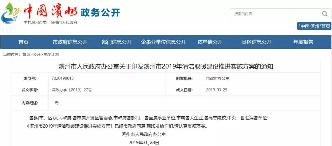 日前,滨州市人民政府办公室印发《滨州市2019年清洁取暖建设推进实施方案》(以下简称:《方案》),提出2019年滨州市城市(县城)完成新增清洁取暖150万平方米,农村地区完成清洁取暖建设18.8万户。