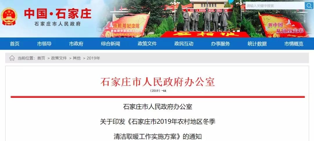 2019年4月30日,石家庄市人民政府办公室印发《石家庄市2019年农村地区冬季清洁取暖工作实施方案》,提出坚持“宜电则电、宜气则气,电代优先;连片和整村推进,分期分批下达今年改造计划,9月底前完成剩余34.94万户清洁取暖改造任务,顺利实现农村地区冬季清洁能源取暖改造试点城市120万户和平原县(市、区)散煤清零目标。第一批先行安排21.9317万户,第二批预安排1.9225万户,石家庄市自行安排的11.0875万户2019-2020年跨年度指导性计划任务,根据气、电保障情况,合理安排组织实施。