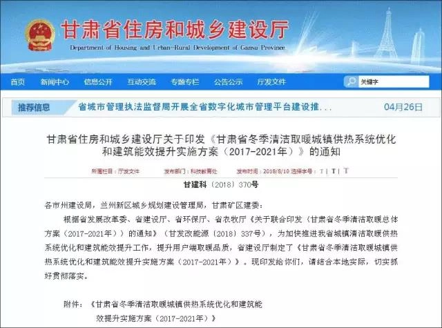 《甘肃省冬季清洁取暖城镇供热系统优化和建筑能效提升实施方案(2017-2021年)》