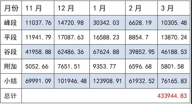 从该大厦电费缴纳数据(见上图)可以很清晰地看到,每个月的采暖电费数据及总采暖电费数据为: