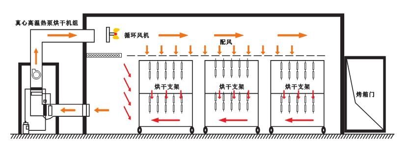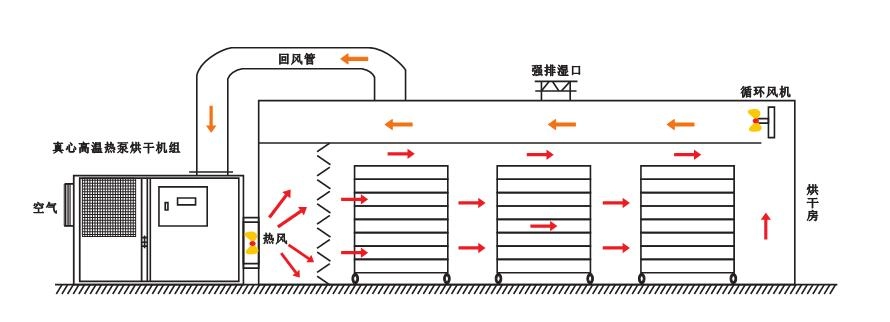 高温热泵烘干机组,主要有翅片式蒸发器(外机)、压缩机、翅片冷凝器(内机)和膨胀阀四部分组成,通过让工质不断完成蒸发(吸取室外环境中的热量)→压缩→冷凝(在室内烘干房中放出热量)→节流→再蒸发的热力循环过程,从而将外部低温环境里的热量转移到烘干房中,冷媒在压缩机的作用下在系统内循环流动。它在压缩机内完成气态的升压升温过程(温度高达100℃),它进入内机释放出高温热量加热烘干房内空气,同时自己被冷却并转化为流液态,当它运行到外机后,液态迅速吸热蒸发再次转化为气态,同时温度可下降至-20℃~-30℃,这时吸热器周边的空气就会源源不断地将热量传递给冷媒。