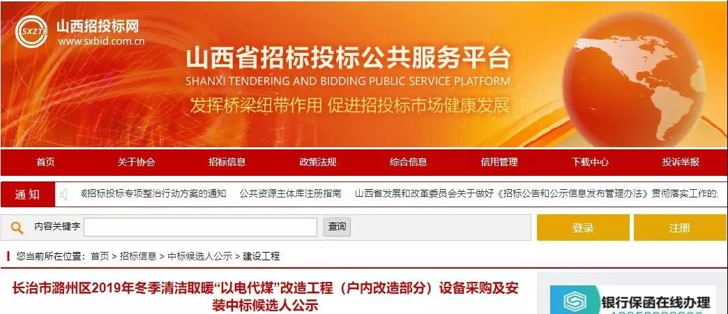 长治市潞州区2019年冬季清洁取暖“以电代煤”改造工程(户内改造部分)设备采购及安装中标候选人公示
