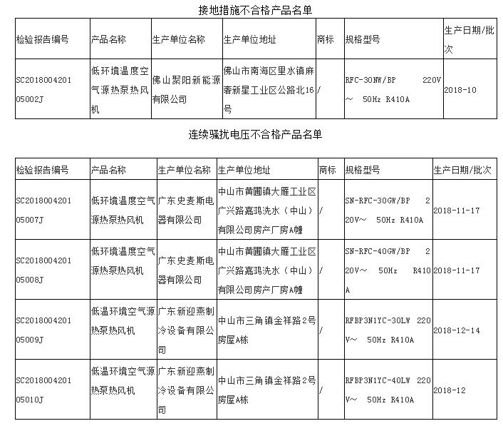 据通告, 本次抽查了广州、珠海、佛山、东莞、中山、河源等6个地市14家企业生产的20批次热泵热风机产品。经检验,发现广东史麦斯电器有限公司、广东新迎燕制冷设备有限公司、佛山聚阳新能源有限公司等3家企业生产的5批次产品不合格。不合格项目主要有“连续骚扰电压”“接地措施”等。