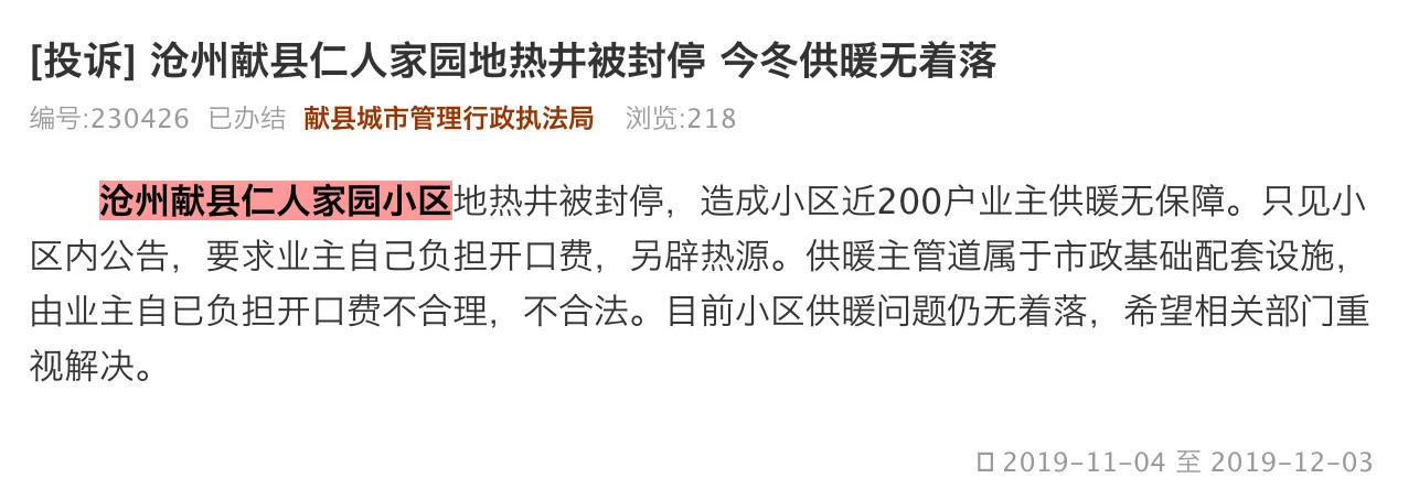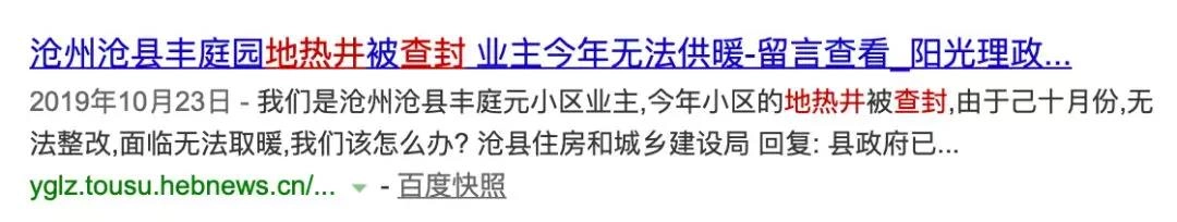 今年,河北出台史上最严厉政策,坚决打击违法开采。不符合地热规划违法开采的地热井,依法查处并提请政府全部关闭取缔;符合地热规划的地热井,到2020年10月31日,仍不能实现合法开采的,依法查处并提请政府关闭取缔。一时间,大量违法开采的地热井被取缔,但居民相应的供暖问题却没有及时解决。