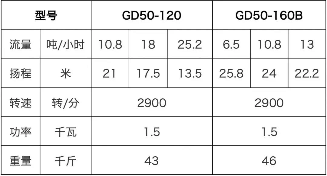 通过表格就比较容易看出来这两个水泵功率都是1.5千瓦,这两个水泵的型号是一样,都是GD50。GD50-120的最大的流量可以达25.2吨,这时扬程只有13.5米,也就是说第一个1.5千瓦的泵,它是偏大流量小扬程的。GD50-160B的水泵,最小的扬程都是22米,最大可以达到25.8米,最大的扬程比上一个可以高一倍。25.8米的时候,流量只有6.5吨的,也就是GD50-160B这个水泵是偏高扬程小流量的。