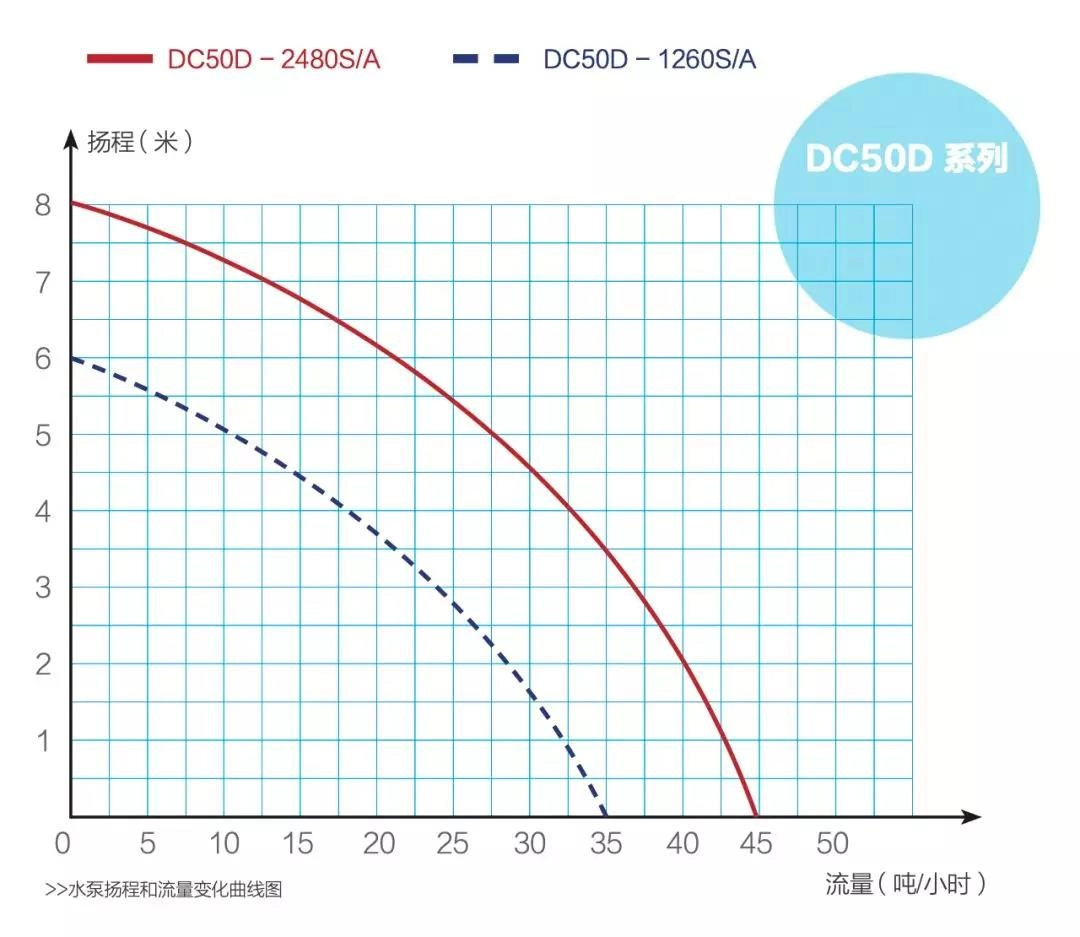 水泵扬程和流量变化曲线图中实线是24080SA,这个泵最大流量是45吨,最高扬程是8米,如果经销商在选水泵的时候,看到这个水泵铭牌上写45吨流量和8米扬程,如果用30吨流量6米扬程的时候,肯定够,而且有富余,结果却不够用。因为这个泵在45吨流量的时候,扬程是0。在扬程8米的时候,它的流量是0。