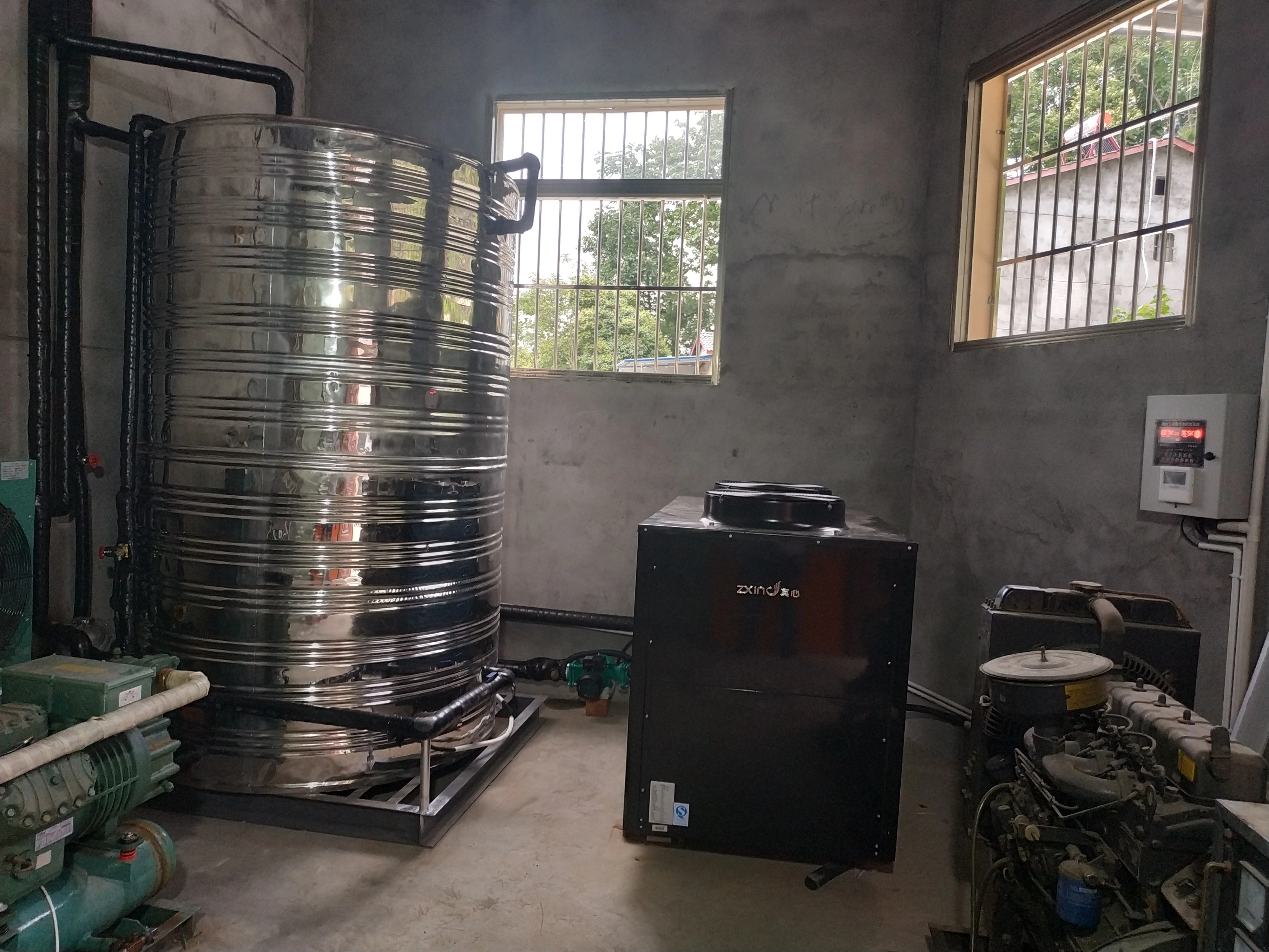 考虑到该屠宰厂安装有冷库,冷库的空调机组有专门的设备间,虽然有2个大窗户,且没有安装玻璃,但冷库空调设备间温度常年较高,且该设备间位置足够,而高温池附近位置较狭小,为了充分利用冷库空调设备间的热量,达到最大限度的节能效果,经与甲方勾通将4吨保温水箱和空气能高温机安放在了冷库空调设备间,这样既可以利用冷库空调设备间的热量制热水,同时,空气能工作时还能对冷库空调设备间进行降温,使冷库设备也更加节能,达到了双赢。