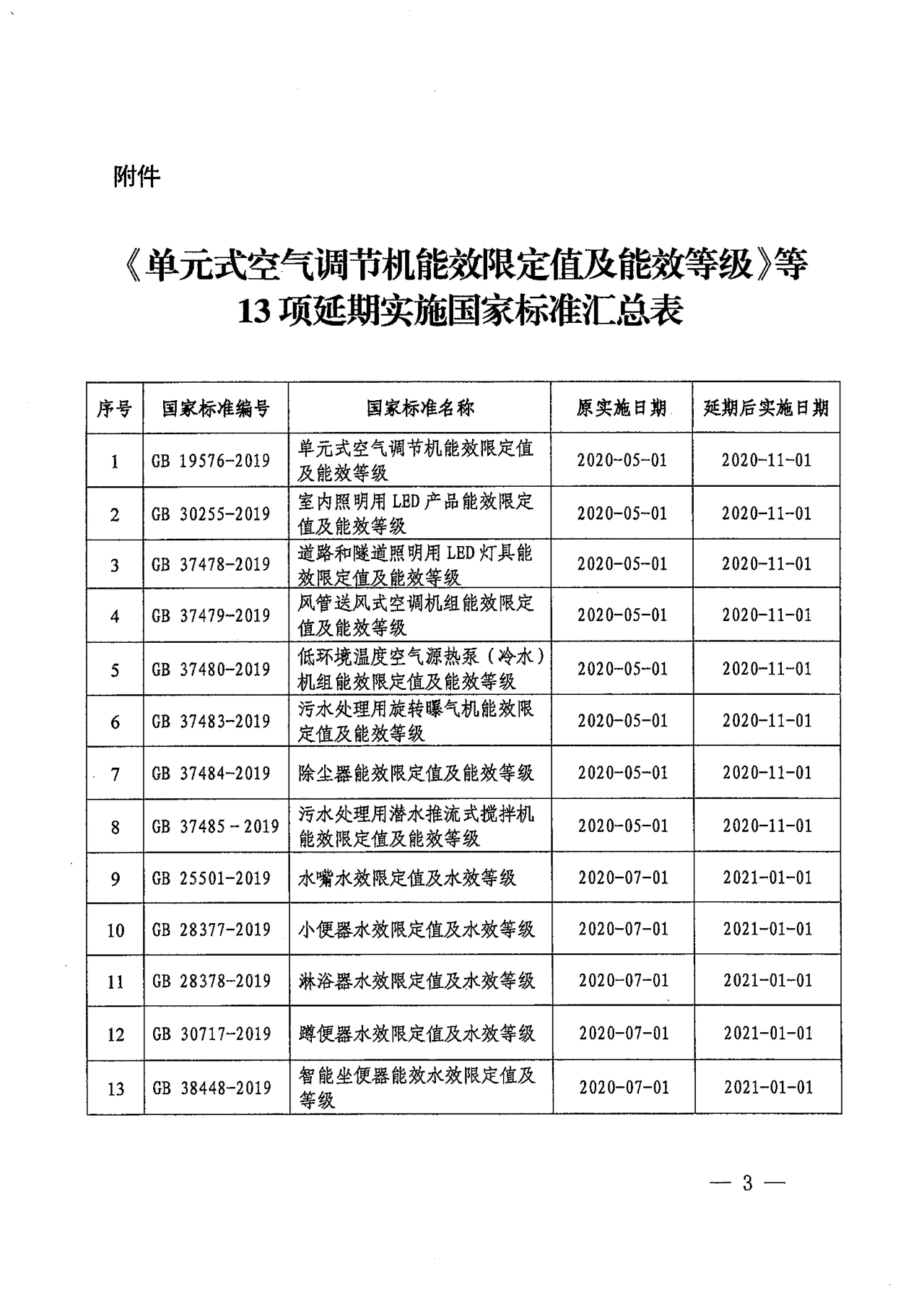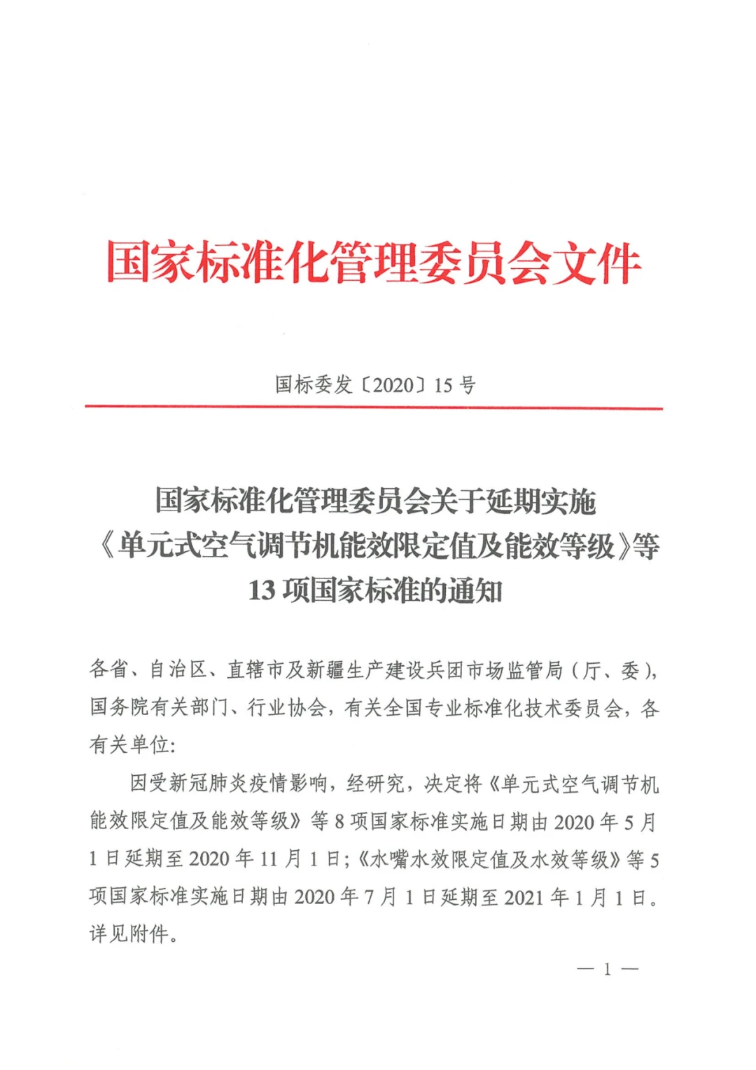 2020年4月1日,国家标准化管理委员会下发了《关于延期实施〈单元式空气调节机能效限定值及能效等级〉等13项国家标准的通知》,通知称,因受新冠肺炎疫情的影响,经研究,决定《单元式空气调节机能效限定值及能效等级》等8项国家标准的实施日期由2020年5月1日延期至2020年11月1日。其中第五项为GB37480-2019《低环境温度空气源热泵(冷水)机组能效限定值及能效等级》。涵盖了低环境温度空气源热泵热风机产品的GB 21455-2019 《房间空气调节器能效限定值及能效等级》未延期,仍为2020年7月1日起实施。