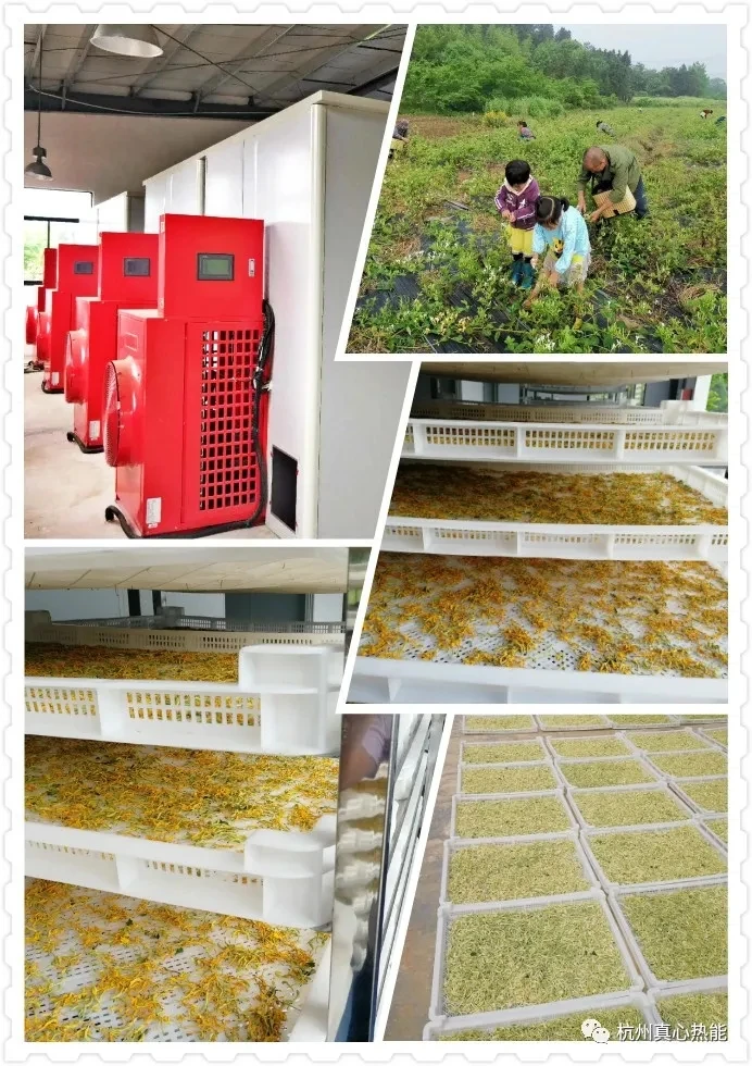 真心热泵烘干机组整齐有序布置在一起,烘干房集烘干排湿加余热回收技术为一体,操作简易高效。厂内宽敞明亮,空间利用率高,这个占地约2000多亩的金银花种植基地,让金银花筑起“金银山”。