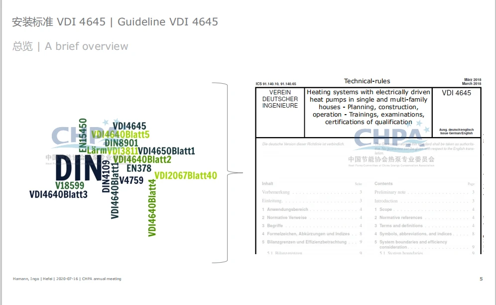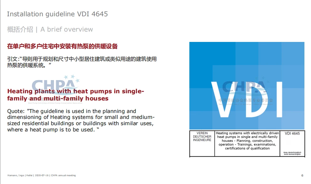 VDI4645共有47页正文内容,12个附件章节。47页正文主要内容为一个项目的全部流程,对潜在客户进行项目现场实地信息调查;给出基本评估建议;进行系统设计,系统设计需参考前边提到的规范;运行和指导,安装完成之后会有一个运行指导,就是通常所说的调试环节;检查维护,附件里提到检查维护有一些工作必须要做,例如准备设计系统水利部分的一些必备的部件,清单的检查,全部完成之后才会进行到运行和指导的步骤,所以最终需要完整的清单,以及在附件当中还会有一些设计的案例,目前大部分热泵企业都会这样去做。