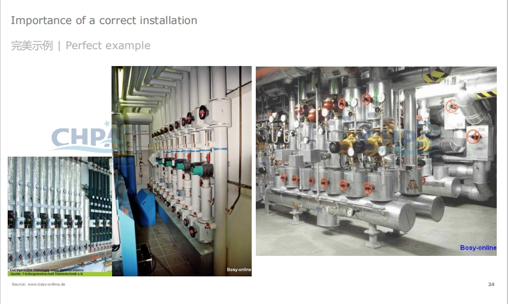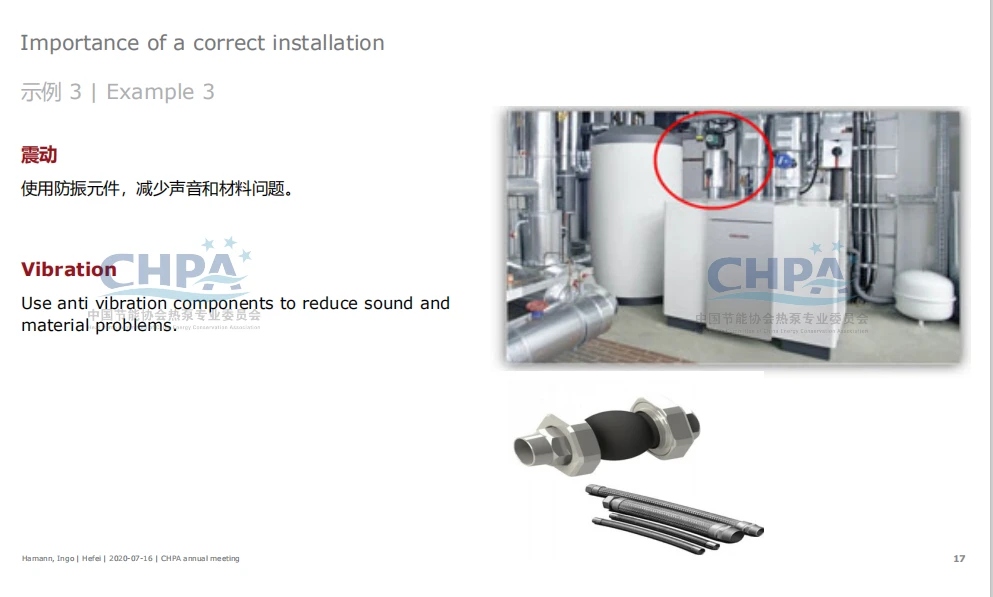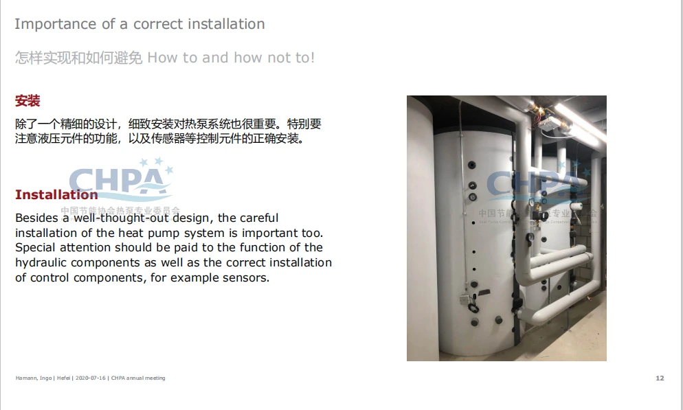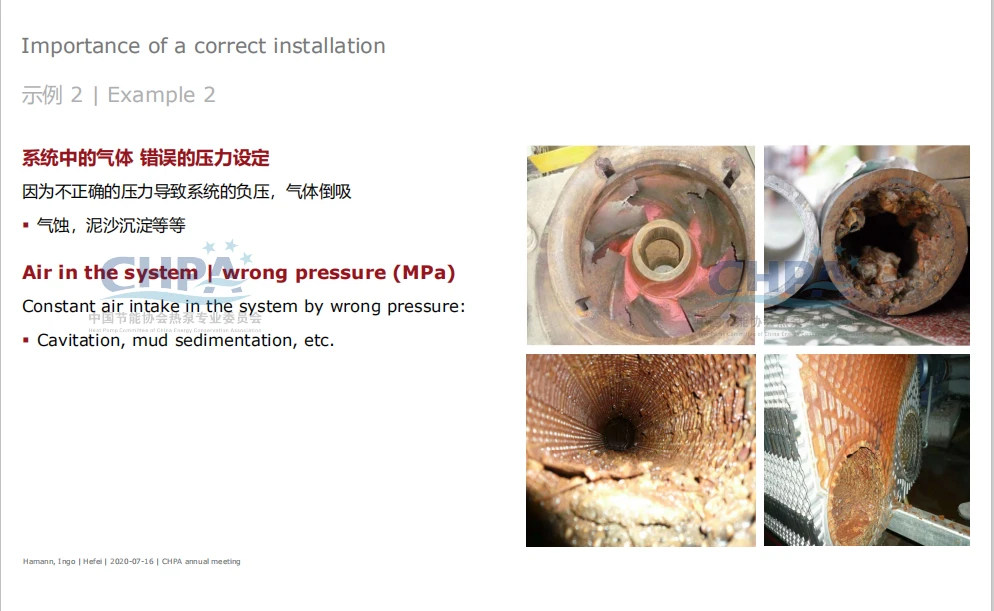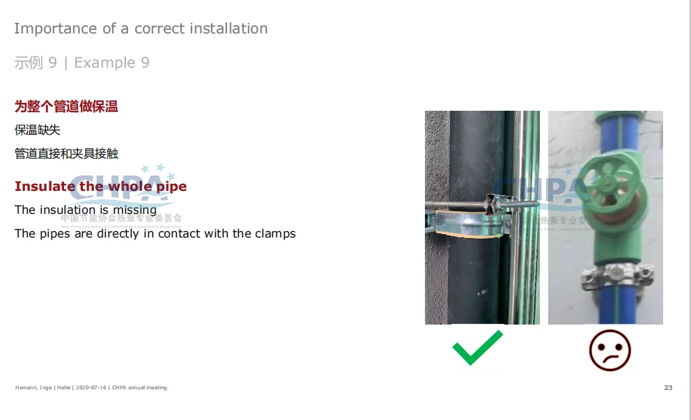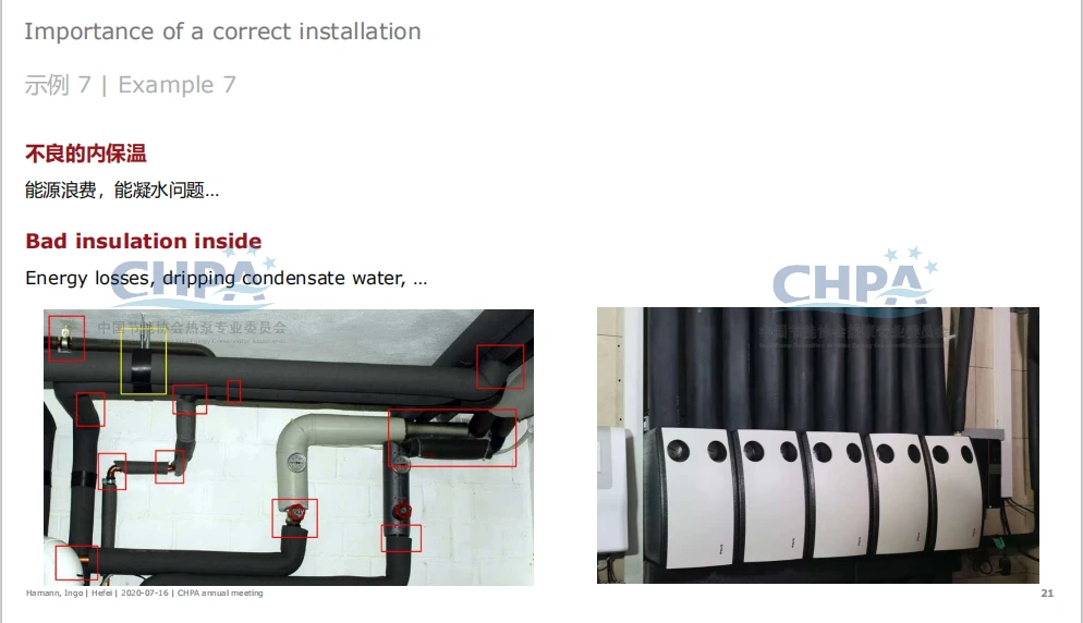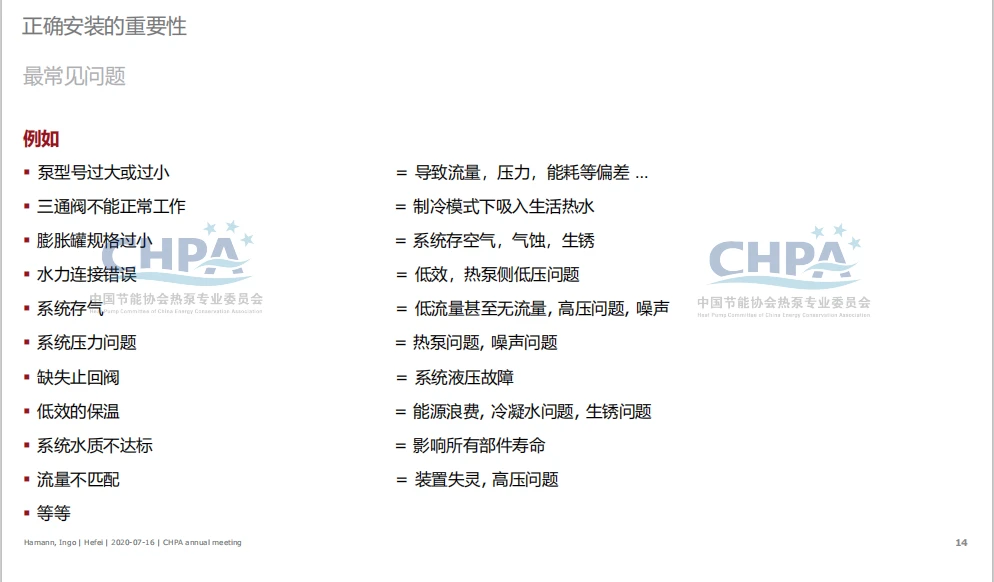 我举一些安装环节出现的问题的例子,泵的型号偏大或偏小,导致流量和压力、能耗的偏差;三通阀工作失效,制冷模式和制热模式之间的切换不能很好完成;膨胀罐规格选用过小,导致系统产生空气、气蚀、生锈等问题;缺失止回阀、低效的保温等等。