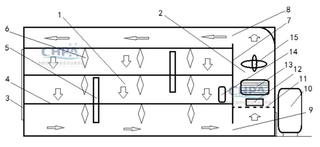 1.装烟室 2.加热室 3.装烟室门 4.挂烟粱 5.观察窗 6.烟叶 7.隔热墙 8.劲风道 9.回风道 10.热泵机组(外) 11.冷凝器支架 12.进风口 13.冷凝器 14.控制仪 15.热风循环风机
