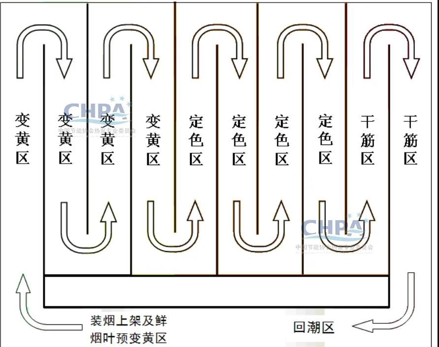 前几年河南省平顶山市和南阳市在燃煤供热巷道式连续化烤房基础上,尝试了热泵供热巷道式连续化烤房(如图2)。根据各区域温度要求,其上方安装热泵和混风风机,烤烟能力500-600亩的连续化烤房,安装6P热泵32台。烟叶(装烟框架)在流水线上从最低温区逐渐到高温区,烟叶烘烤形成了流水作业,烤烟季节实现连续化生产。流水线运行速度和热泵、风机由计算机控制。