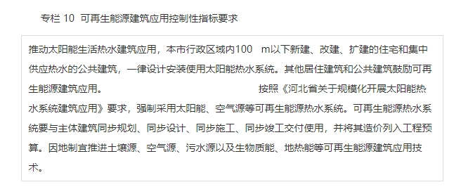 规划第四章规划分区与控制要求中可再生能源建筑应用部分提到,持续推进新建(改、扩建)建筑中太阳能热水系统应用的普及工作,实施太阳能热水系统与建筑一体化的设计和施工,因地制宜推进土壤源热泵、空气源热泵等技术的建筑应用。