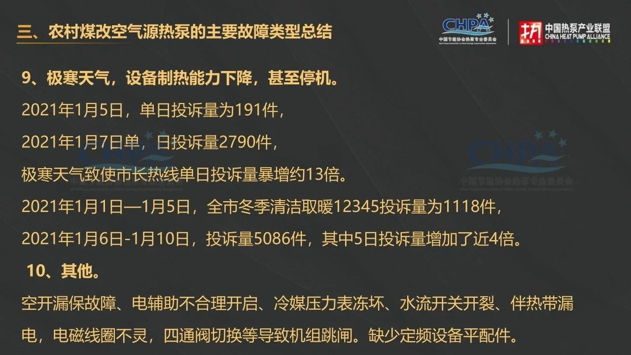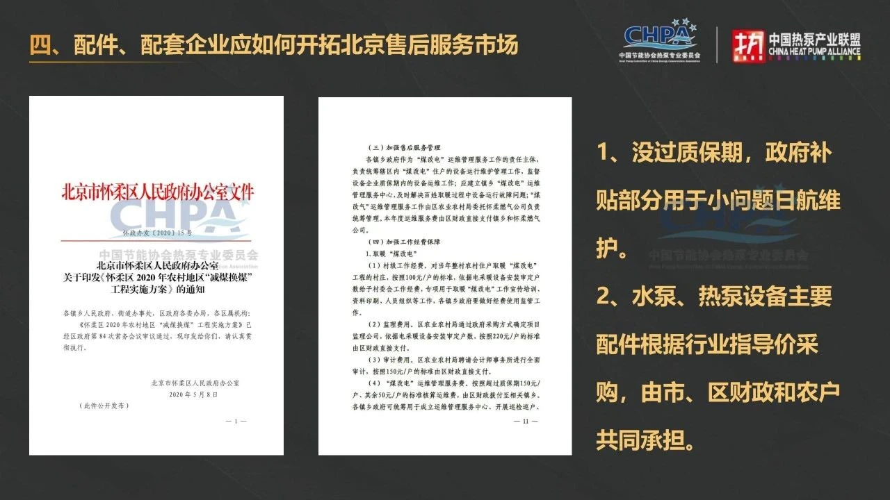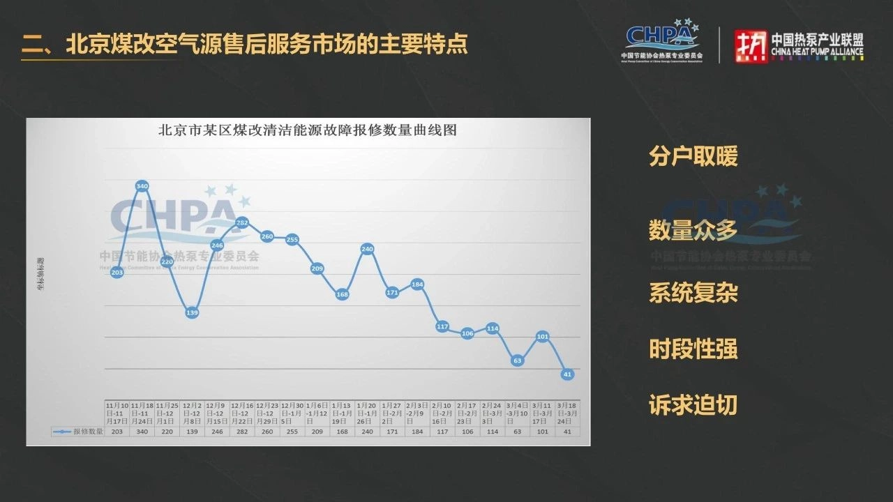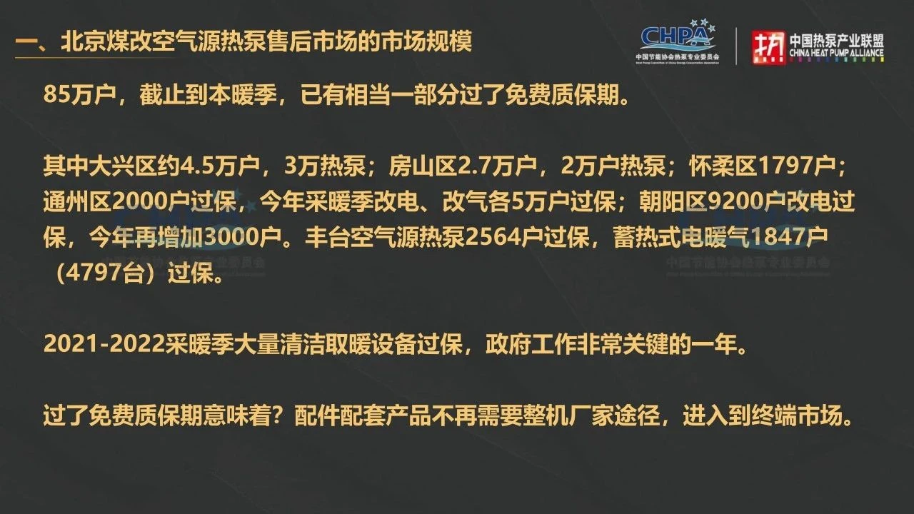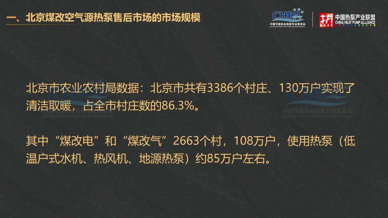 大家好,我今天的分享主要包含四个方面:一个是北京煤改空气源热泵售后的市场规模,二是北京煤改空气源售后服务市场的主要特点,三是农村煤改空气源热泵的主要故障类型,四是配件、配套企业应如何开拓北京售后服务市场。