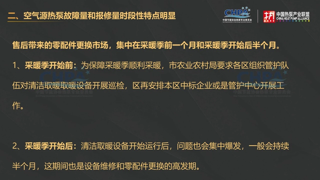 下面重点谈一下空气源热泵故障和报修量的时段性特点,售后服务工作主要集中在采暖季前一个月和采暖季开始后半个月: