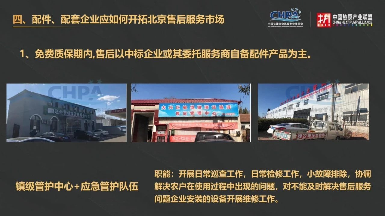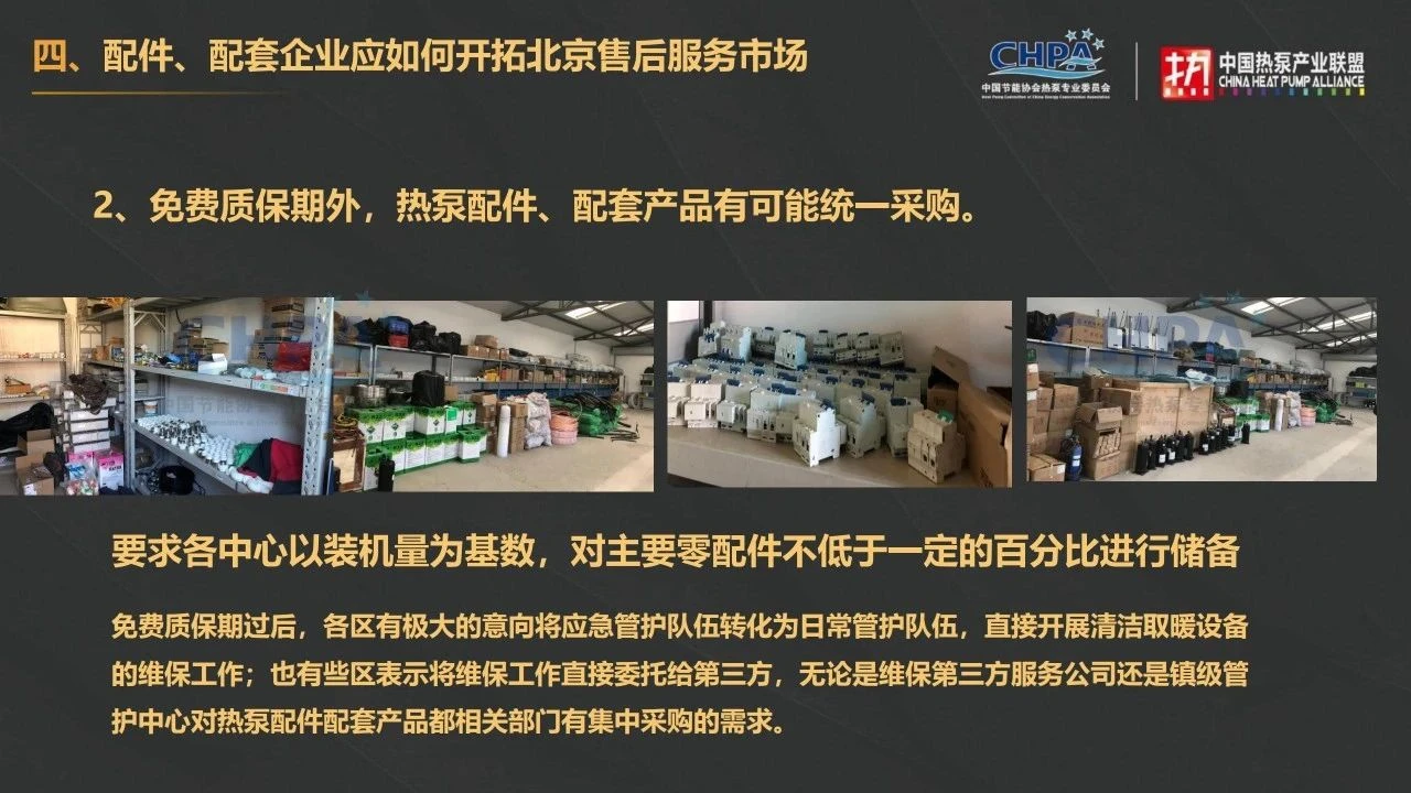 此外,免费质保期过后,各区有极大的意向将应急管护队伍转化为日常管护队伍,直接开展清洁取暖设备的维保工作;也有些区表示将维保工作直接委托给第三方,无论是维保第三方服务公司还是镇级管护中心对热泵配件配套产品都有集中采购的需求。