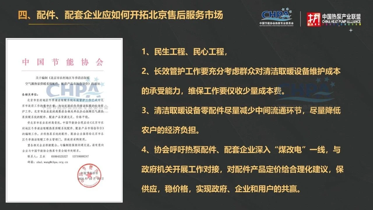 北方地区冬季清洁取暖是一项重大的民生工程、民心工程,长效管护工作要充分考虑群众对清洁取暖设备维护成本的承受能力,维保人员要仅收少量成本费,清洁取暖设备零配件尽量减少中间流通环节,尽量降低农户的经济负担。针对北京市,乃至整个北方地区的冬季清洁取暖长效管护工作,中国节能协会热泵专委会将结合北方各省的实际情况以及工作特色,有针对性的开展相关工作,如为北京市热泵产品编制配件配套产品指导价格,编制配件配套产品推荐目录,2021年中国热泵行业年会期间组织专业清洁取暖维保论坛等工作,配合各地主管部门进一步完善冬季清洁取暖工作。