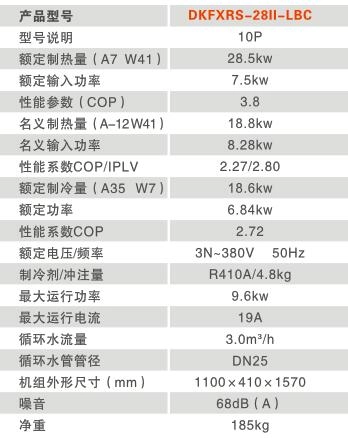 注:1、额定制热量测试工况为:干环温度7℃,湿球温度6℃,进水温度36℃,出水温度41℃,