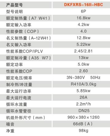 注:1、额定制热量测试工况为:干环温度7℃,湿球温度6℃,进水温度36℃,出水温度41℃,